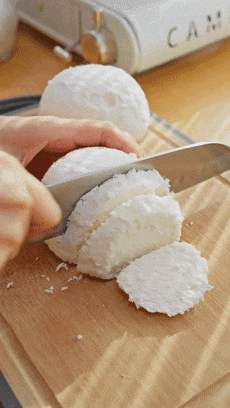 切好的馒头片,扔进无油无水的不粘锅里,开小火,烙到底面焦黄,就能翻面了。