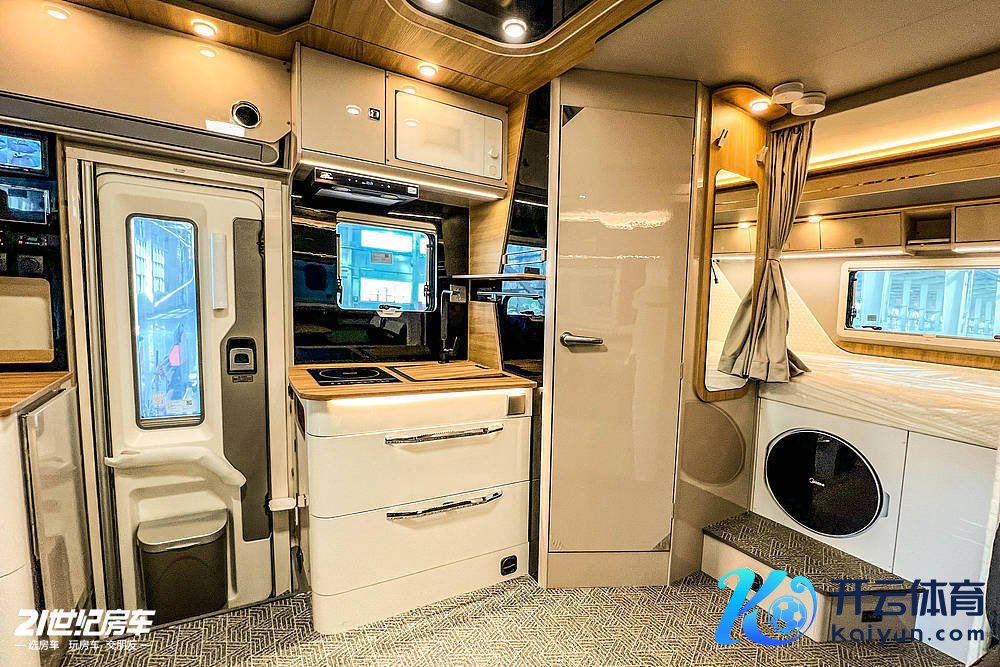 厨房区在乘客门一侧,通过翻折桌板与左侧的置物台酿成一个超大的操作台面,厨房区配有电磁炉、高脚水龙头、带盖板的洗菜池,上方抽油烟机、微波炉,下方都是储物空间。乘客门的上方是一台小米变频空调,节能省电,制冷收尾高。雪柜在会客区卡座后方,容积为142L,品牌为赛特福德。