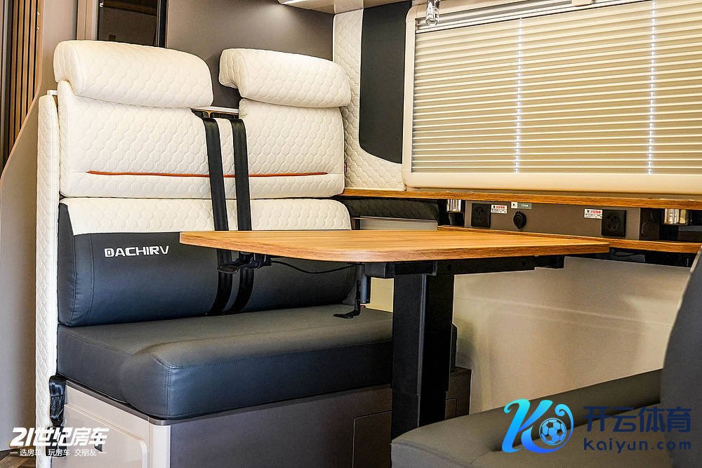 会客区遴荐4东说念主对向卡座沙发体式,沙发座椅和靠背、头枕跟着家具的迭代也在束缚升级,乘坐懒散性有较好的感受,中间是气动升降的桌板,可4向改造。侧面外推窗下两组五孔插座,一个12V USB充电口,还有两个水杯槽。