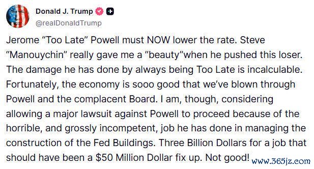 特朗普在酬酢媒体上发文,条目鲍威尔立即降息,并责骂他“老是行动稳妥”。